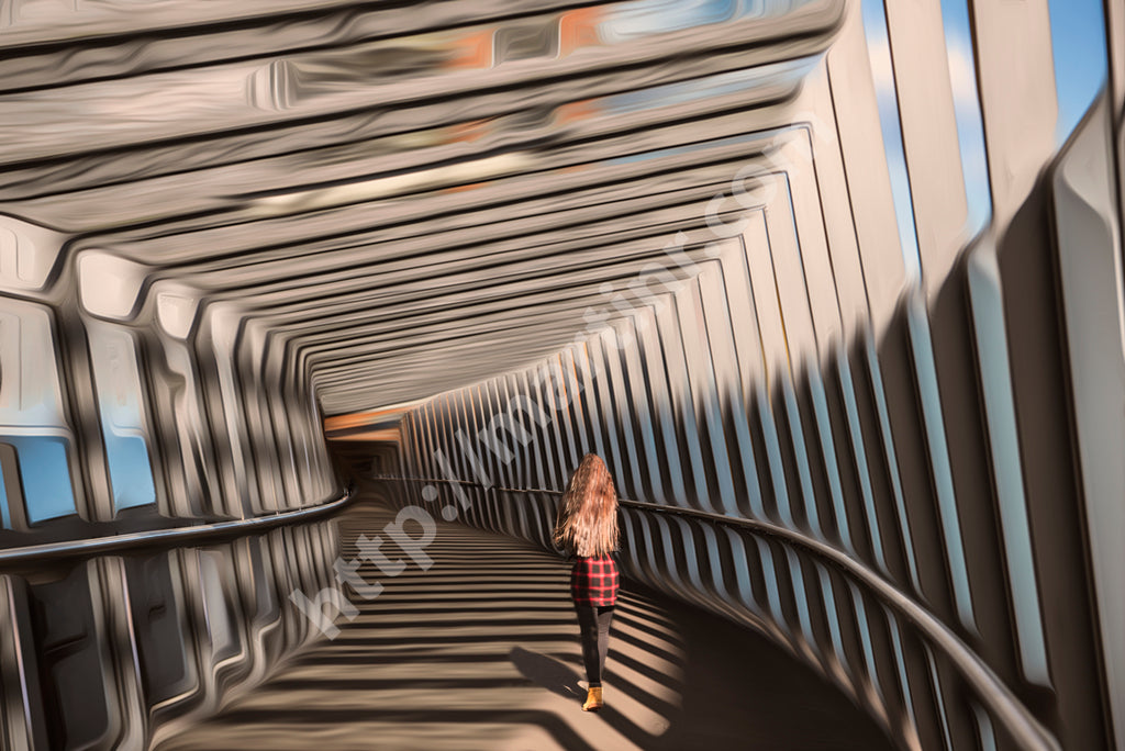In this piece, digital manipulation stretches the lines and shapes of a simple walkway, turning it into a swirling, almost fluid space. Through careful layering, the composition becomes a digital collage, where the structure seems to melt into something more abstract. The lone figure walking forward adds a sense of isolation, drawing the viewer deeper into this altered reality, where the familiar becomes something more dreamlike, teetering on the edge of fantasy.