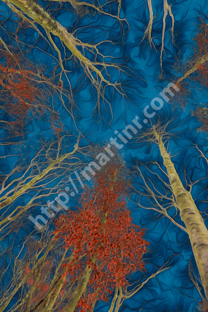 "Blue Roof" captures the ethereal interplay of nature’s canopy through meticulous digital manipulation and collage. Beginning with a photographic foundation, each layer transforms bare branches and vivid red foliage into an immersive artwork, where a cerulean sky serves as the canvas. The upward perspective invites viewers to lose themselves in the labyrinth of textures and tones, highlighting the delicate tension between abstraction and realism. This piece exemplifies the fusion of traditional photographic techniques with modern digital artistry, embodying a sense of wonder and connection to the natural world.