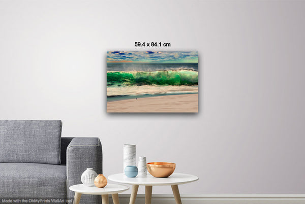 The artwork employs a romantic realism style with heightened color saturation that borders on the surreal, particularly in the wave's vivid green luminescence and the sky's painterly cloud formations. The horizontal composition creates natural layers - beach, breaking wave, distant ocean, and expansive sky - that draw the viewer's eye across the scene while the central wave serves as the dramatic focal point. The technique appears to blend photographic realism with digital enhancement or painterly effects, creating smooth gradations and an almost dreamlike quality in the water's transparency.