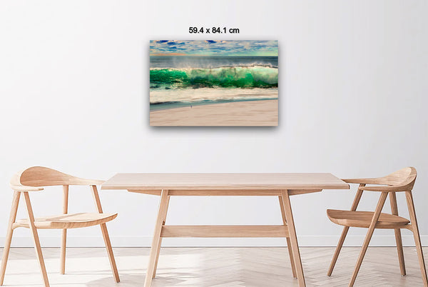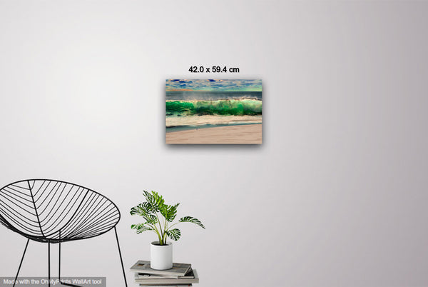 The emotional impact is both awe-inspiring and contemplative, evoking the sublime power of nature while maintaining a sense of tranquil beauty. The lone figure on the beach adds a meditative human element that invites viewers to imagine themselves witnessing this spectacular natural moment. The interplay between the warm earth tones of the sand, the cool blues of sky and distant water, and the striking emerald of the central wave creates a harmonious yet dramatic color symphony that captures both the serenity and raw energy of the coastal environment.Limited Editions Digital Manipulated Photography.