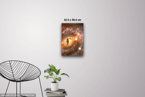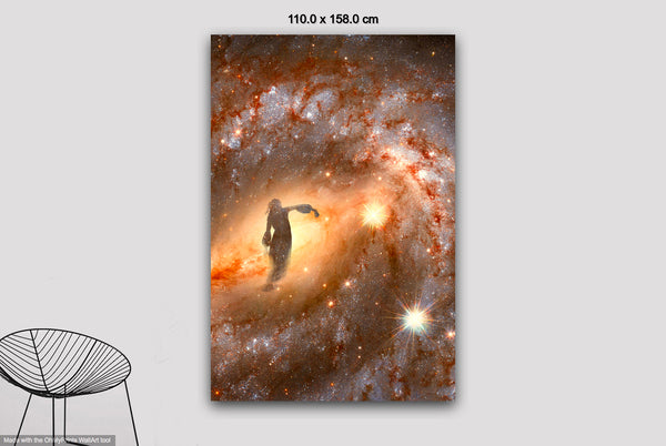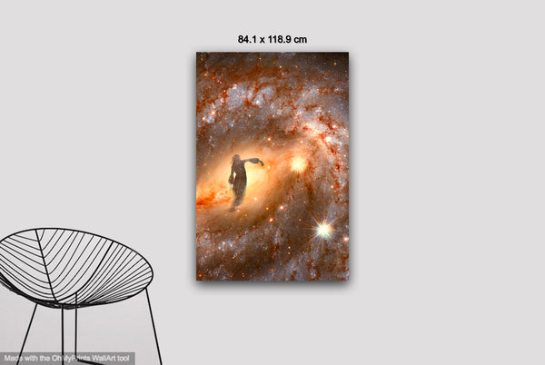 The swirling colors of the nebula create the vision of a female dancer in the stars. Her flowing figure seems to move with the cosmic currents, her body twisting gracefully through the heavens. The stars form her limbs, while radiant clouds of gas and light swirl around her, capturing a moment of elegant motion, as if the universe itself is performing a dance of light and energy.
