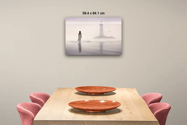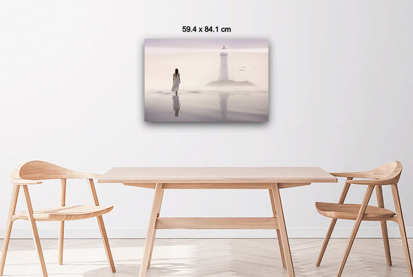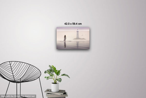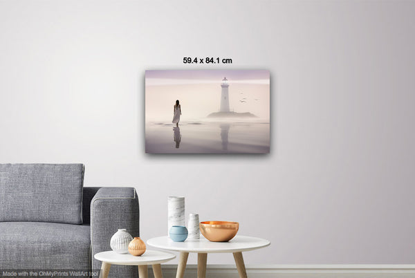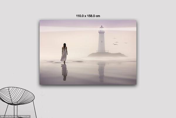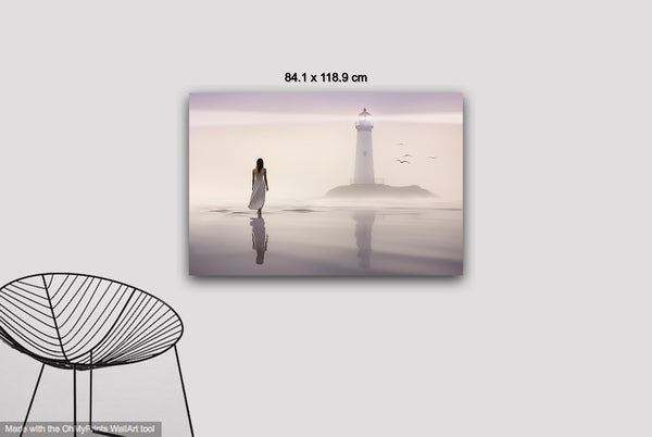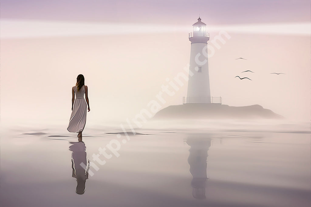 In this minimalist sunset scene, a lone, elegant female figure stands by the coast, accompanied by a lighthouse in the sea. Both are beautifully reflected in the calm waters, creating a serene and ethereal image. The entire scene is bathed in a pale pink, almost white, hue, capturing the tranquil and delicate beauty of the moment.
