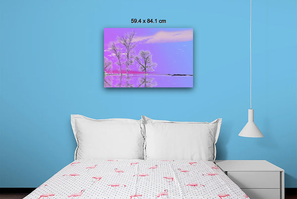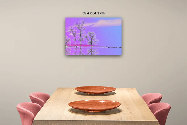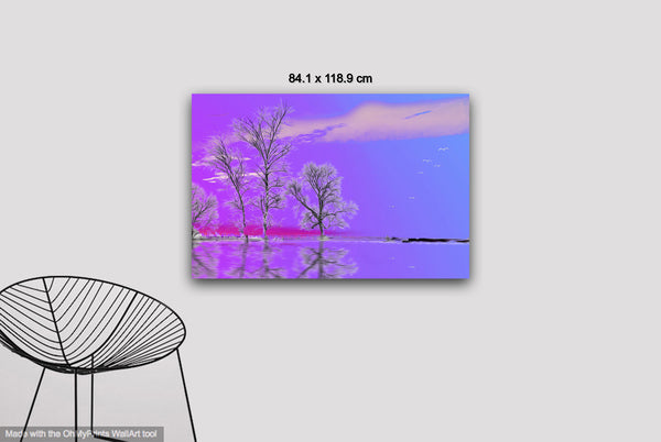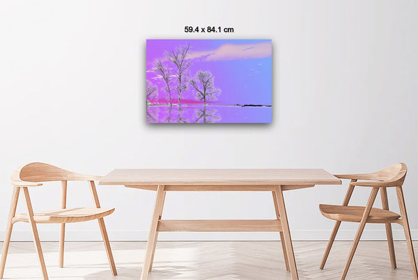 This serene image captures the essence of peace and tranquility, featuring a simple purple sky and a calm lake reflecting a few trees. The white silhouettes of flying birds and tree branches gently caress the purple sky, creating a harmonious and soothing scene that evokes a deep sense of calm and serenity.