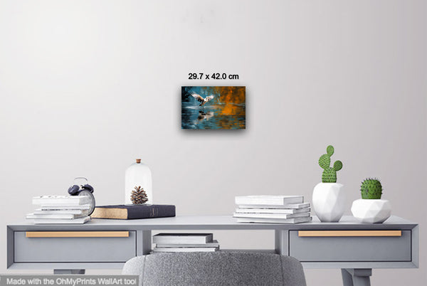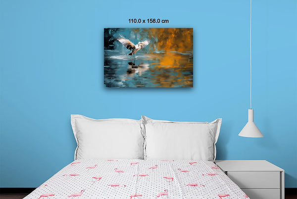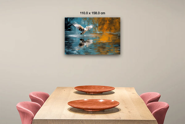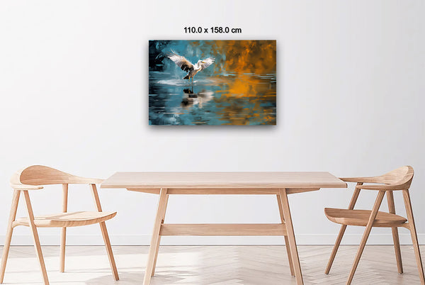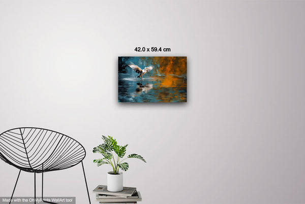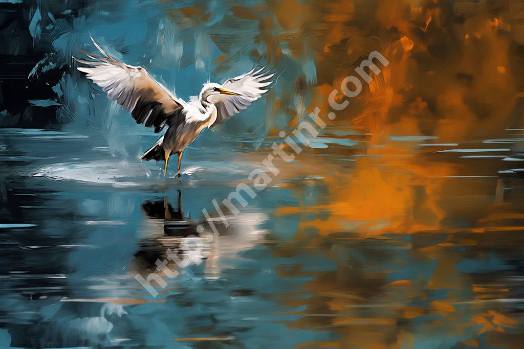 A heron, captured in a moment just before taking flight, spreads its wings in a scene that merges the serene tones of a greenish-blue pond with bold, abstract orange bursts. This image is a transformation of my original photograph, redefined through a dynamic process of digital manipulation, photographic collage, and generative collage techniques. The interplay of these elements creates a vivid, fluid world that bridges reality and abstraction, breathing new life into the natural moment of the bird’s poised departure.