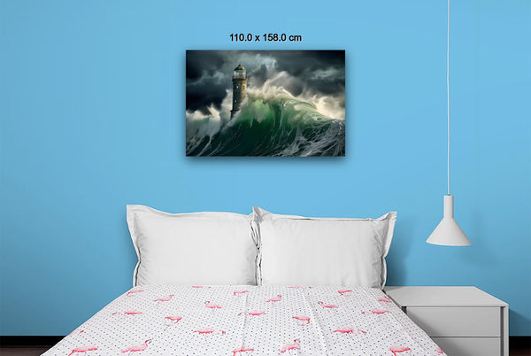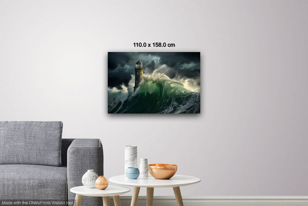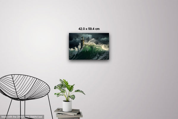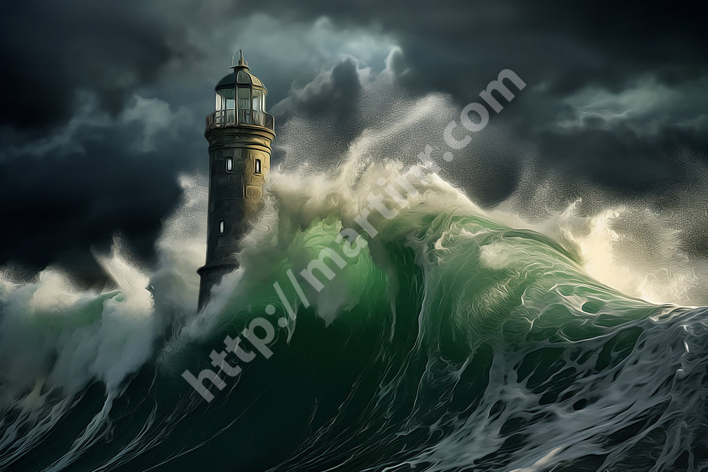 The overall mood is one of sublime drama and romantic tension between human resilience and natural forces. The lighthouse serves as a powerful symbol of steadfastness and guidance amid chaos, while the churning seas and stormy atmosphere evoke feelings of awe, danger, and the magnificent power of nature. The composition's vertical emphasis, with the lighthouse reaching toward the turbulent sky while waves surge upward from below, creates a dynamic sense of movement and struggle that captures the eternal battle between civilization and the untamed sea.Limited Editions Digital Manipulated Photography.