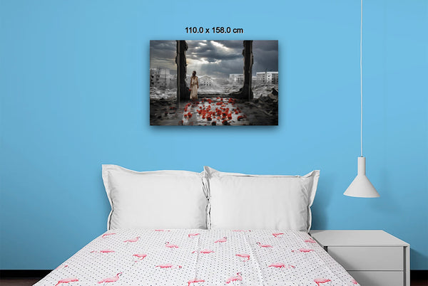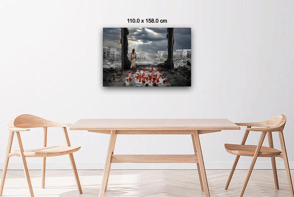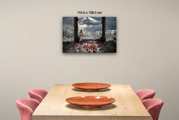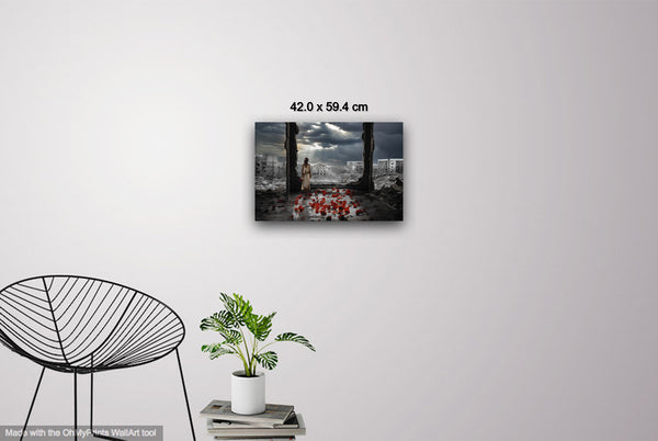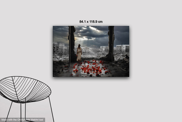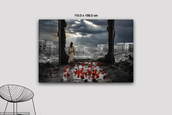 "Scars and Blossoms" uses digital manipulation to transform a scene of destruction into a poignant digital collage. Layer by layer, the crumbled structures and scattered red flowers evoke both loss and remembrance. The female figure, with a single red rose, becomes a symbol of mourning and resilience. This piece masterfully blends light, shadow, and color to reflect on the cost of conflict and the enduring pursuit of peace, creating an emotional narrative from photographic origins.
