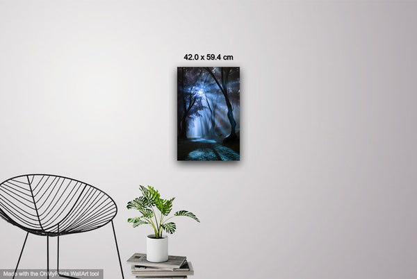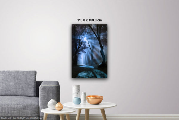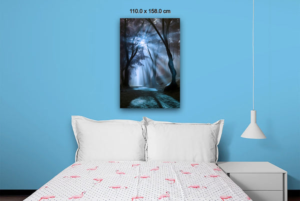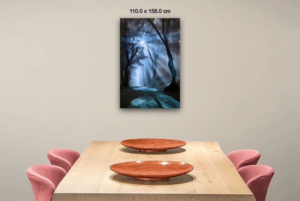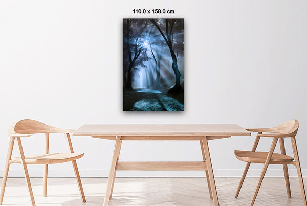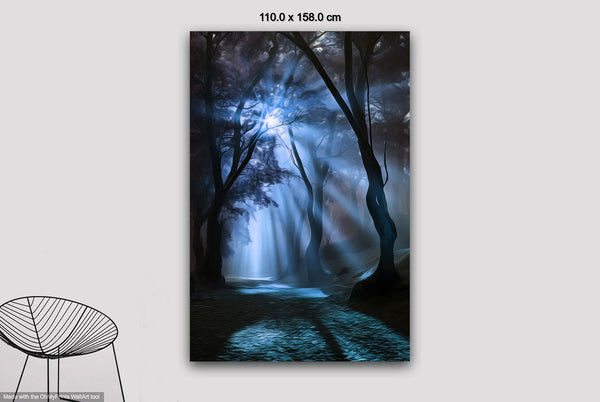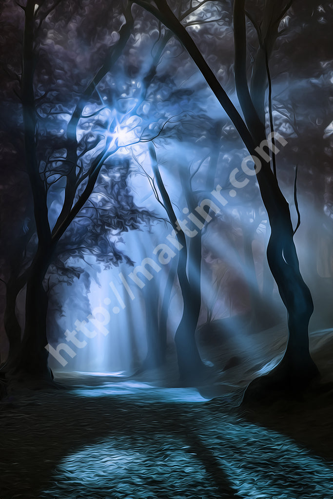 The artistic technique employs smooth digital painting methods with soft gradients and subtle color transitions that enhance the magical realism aesthetic. Wispy, cloud-like formations of light seem to dance between the tree branches, suggesting supernatural or fantastical elements at play. The vertical composition emphasizes the towering height of the trees while the central light source creates a natural focal point that guides the eye upward through the canopy. The overall mood evokes mystery, tranquility, and wonder, reminiscent of fairy tale forests or spiritual sanctuaries found in fantasy art and romantic landscape painting.Limited Editions Digital Manipulated Photography.