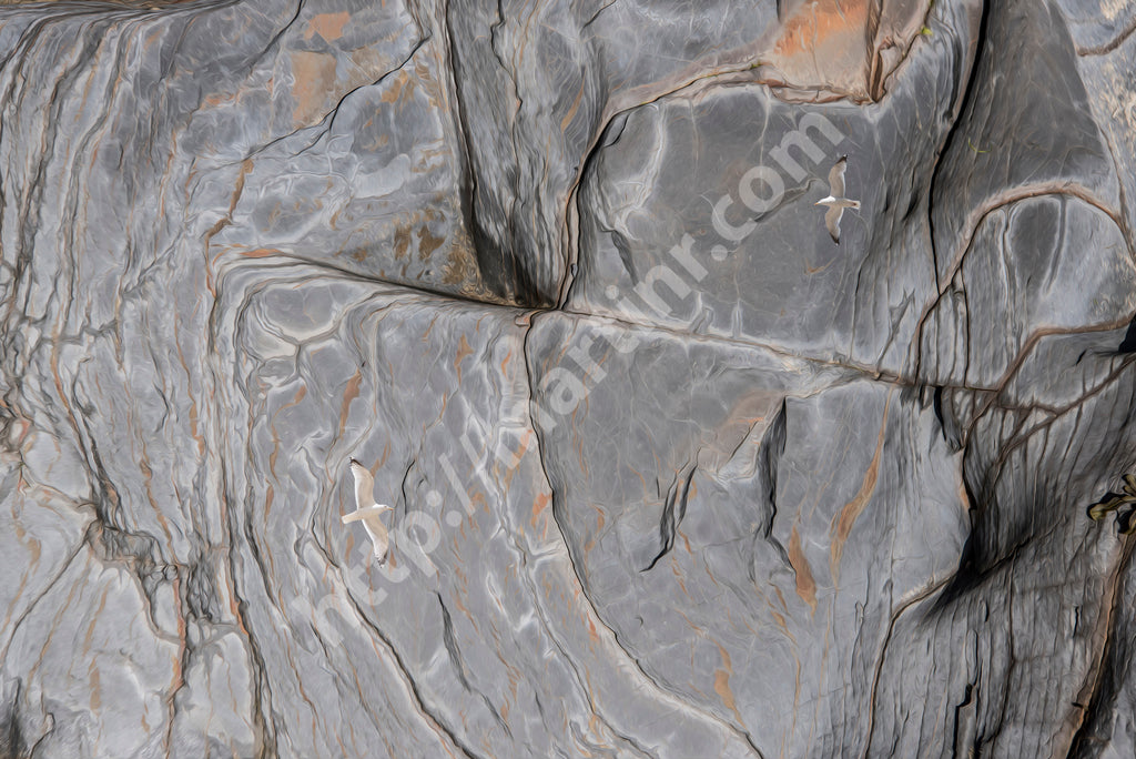 This image belongs to my Cliff Scapes collection, which started while walking the coastline in Cornwall, UK. If you look carefully, you will notice I was not looking up to the cliffs, but down to the ground, sand, water... the cliffs of imagination. A single bird soars in the distance, its silhouette standing out against the open sky, flying over the smooth cliffs. The scene feels expansive, capturing a sense of freedom and quiet. My gaze didn’t rest on the cliffs themselves but was drawn to the natural details below—elements of sand and water that form cliffs only in the mind. The image was created using digital techniques, carefully refining each element.
