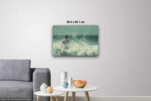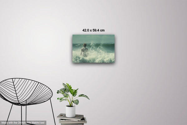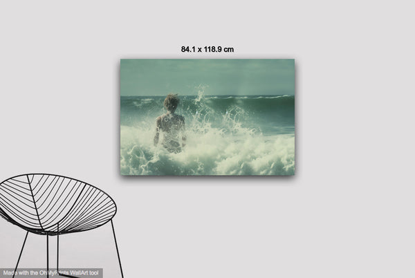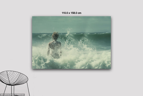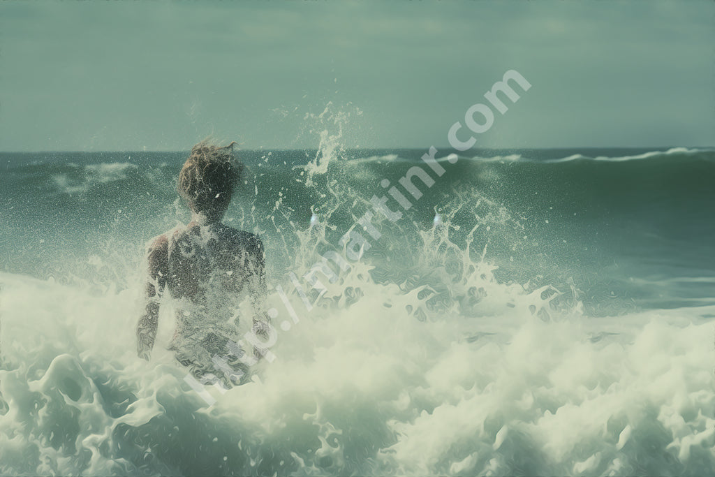 Amidst Faro’s rugged waters, a young woman moves with playful elegance, countering the sea’s raw power. This image captures the dynamic interplay of nature’s fierce energy and the serene beauty of the female form.