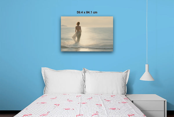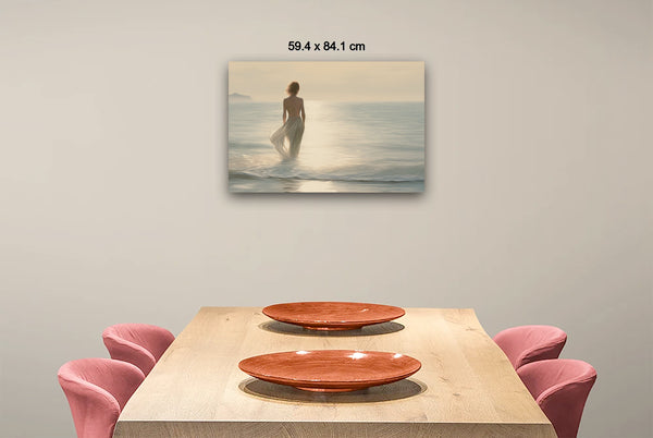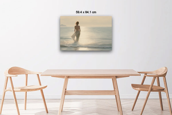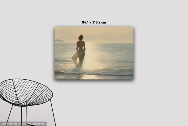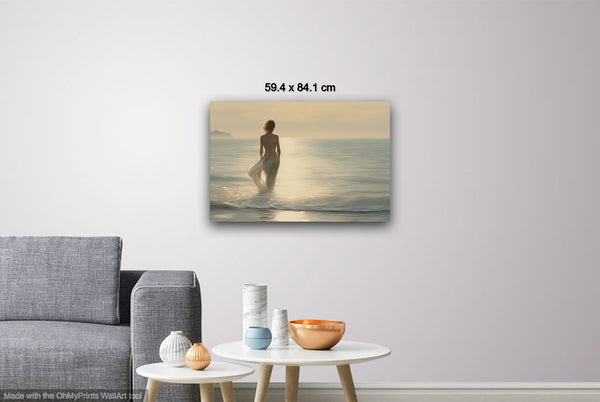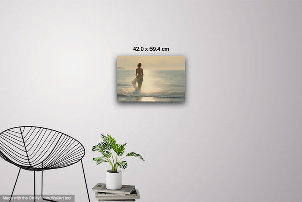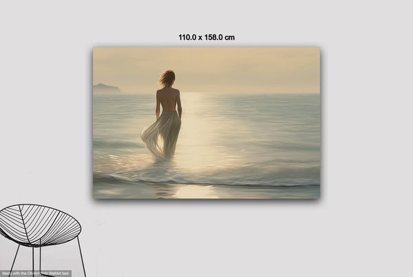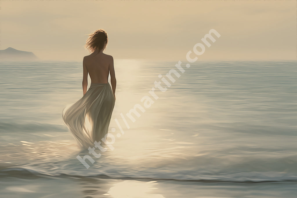 An elegant figure in a white dress stands serenely at the sea shore, bathed in the strong reflection of the sun behind her. The tranquil waters mirror the calmness of her presence, and through detailed post-production, the image is elevated to highlight the harmony between light, water, and human grace.