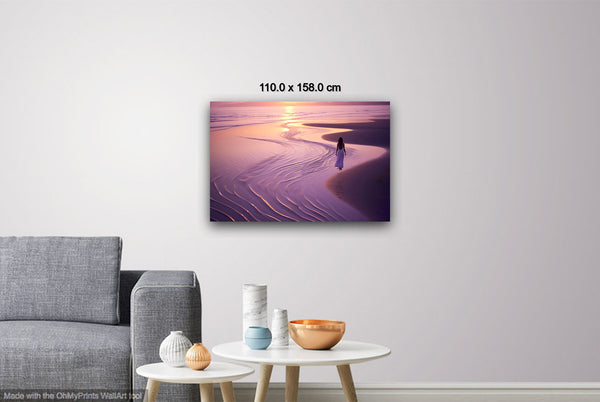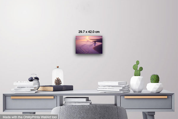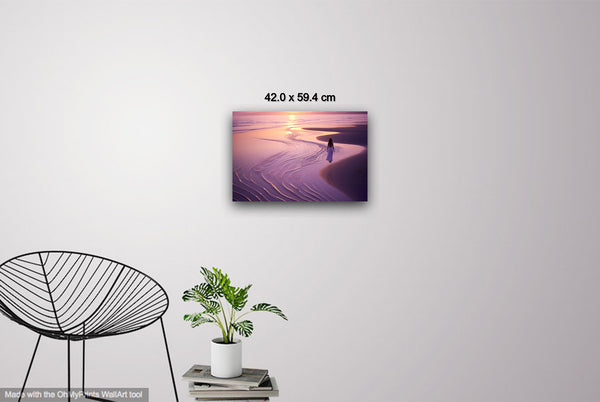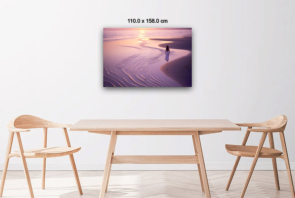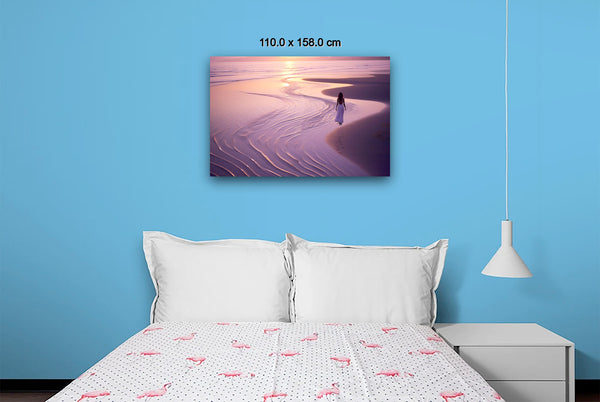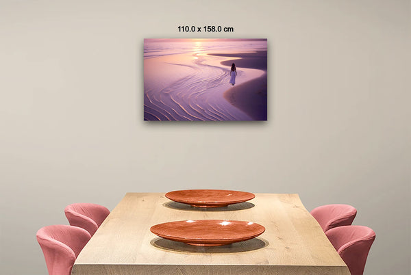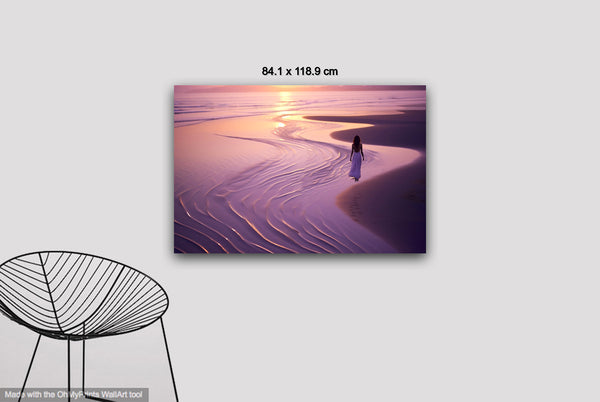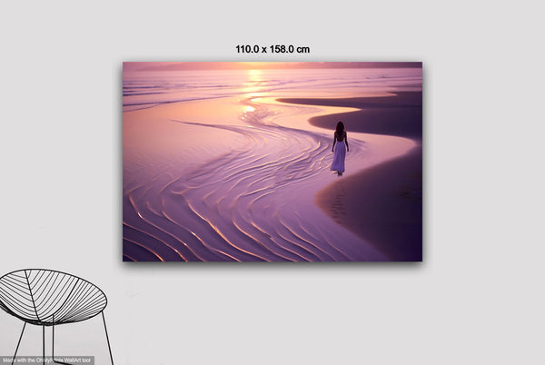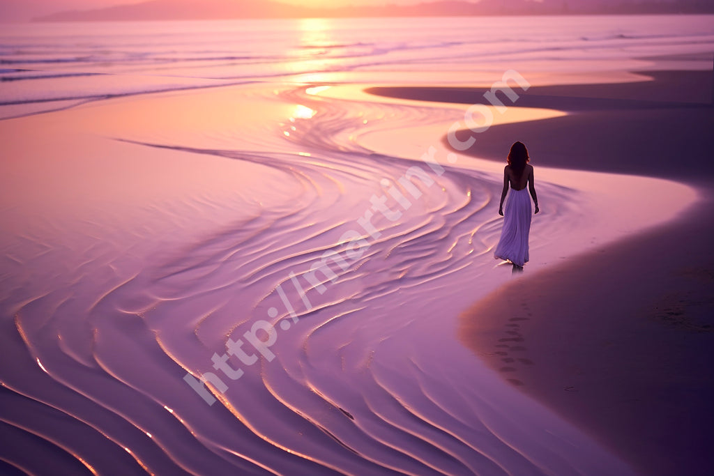 At sunset, the golden light casts a warm glow over the sand’s undulating lines, mirroring the gentle flow of the sea. A woman in white stands quietly, absorbing the serene moment. The image is carefully refined in post-production, where every detail is perfected to evoke a deeper emotional connection.