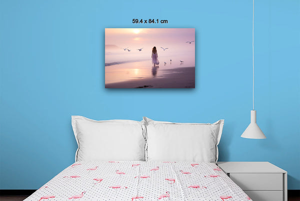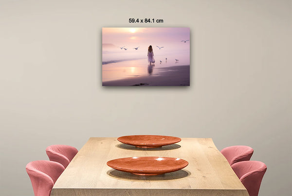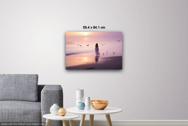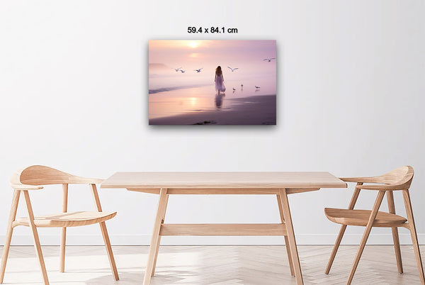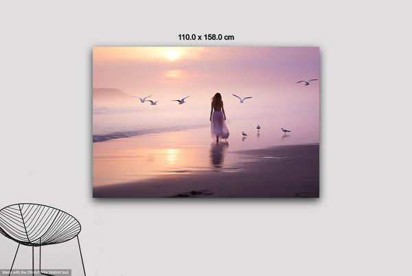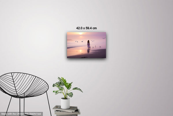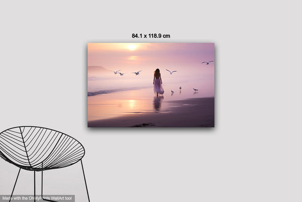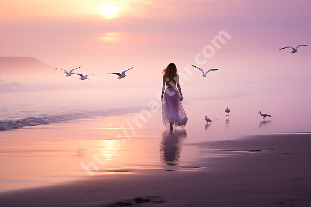 A young woman stands quietly at the water’s edge, watching seagulls fly above and walk nearby as the calm sea caresses the sand. The sunset bathes the scene in a gentle glow, and detailed post-production elevates the quiet harmony between her presence and the natural surroundings.