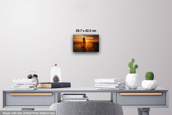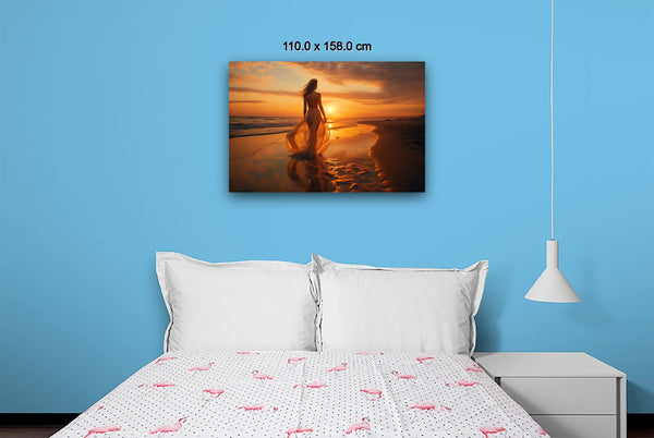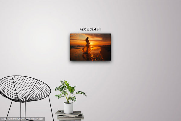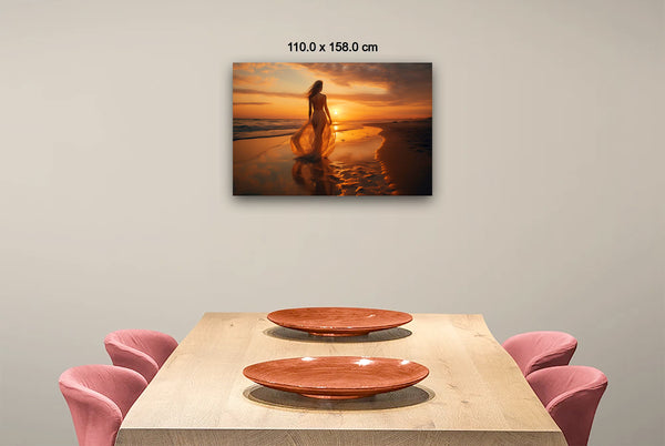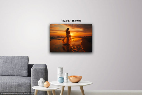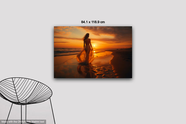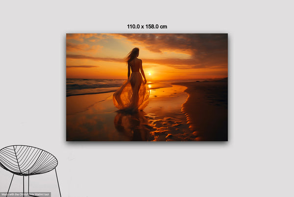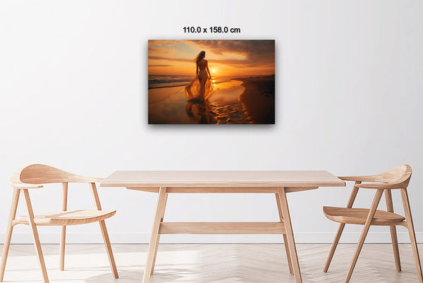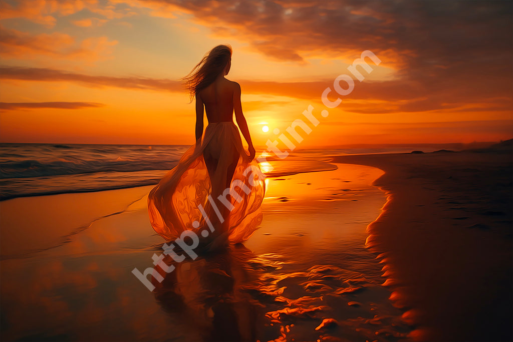 Bathed in the warm, orange light of a sunset, a female figure in white exudes elegance and sensuality. The scene’s rich colors and soft light create a captivating atmosphere, which is meticulously enhanced through a detailed process of digital manipulation to bring out the full depth of the image.