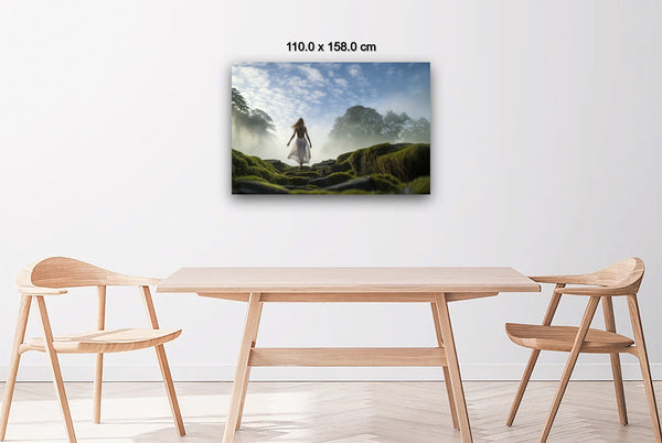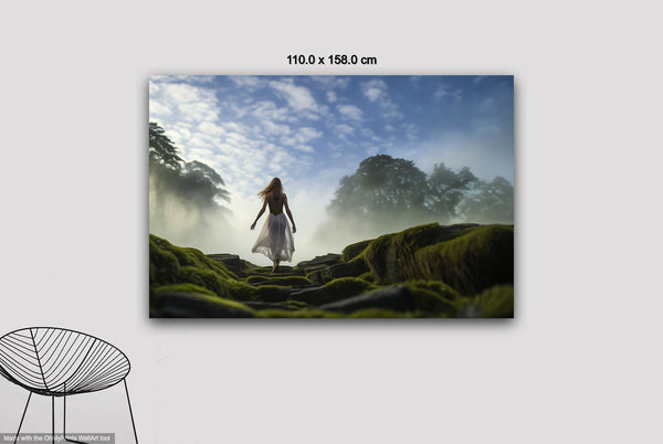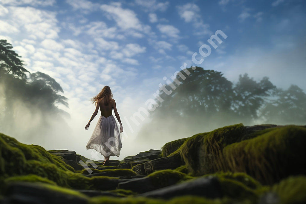 Under a bright blue sky, a woman walks along moss-covered foggy ground, surrounded by the vivid green of the forest. Her movement flows with the natural beauty around her, and through detailed editing, the scene is transformed into a vibrant portrait of serenity and life.