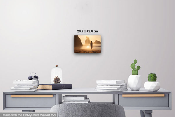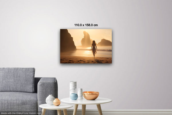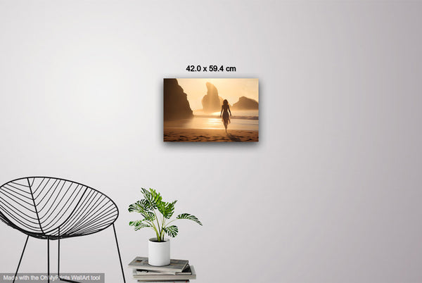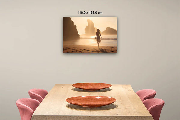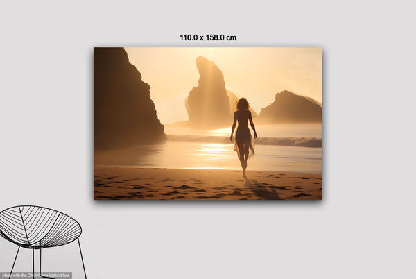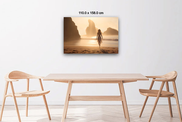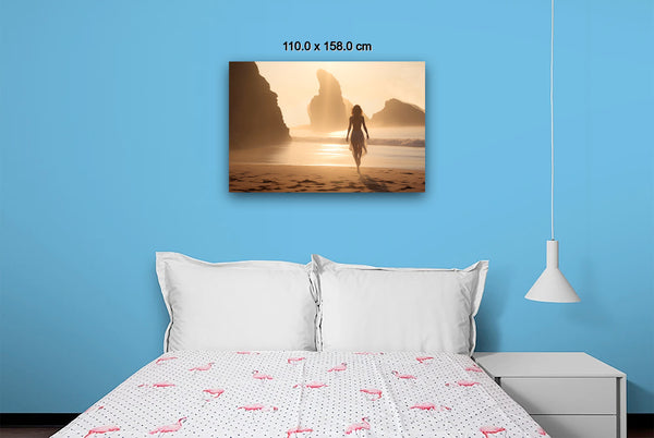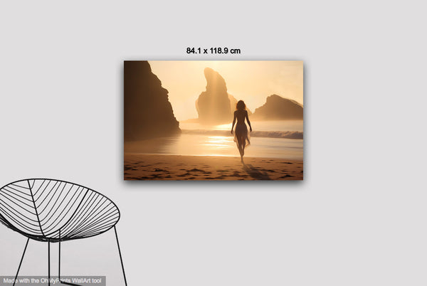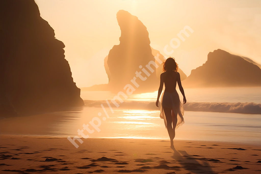 A woman stands on the coastline, bathed in the intense heat of the sun. The image is almost glowing, with shades of ochre and white that make you feel the warmth. Her translucent clothes add to the sensuality. While photography used to be edited in darkrooms, today it's transformed through digital techniques. This scene is inspired by the North Coast of Cornwall.