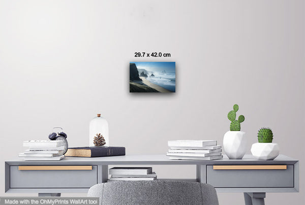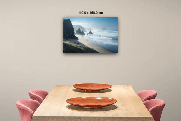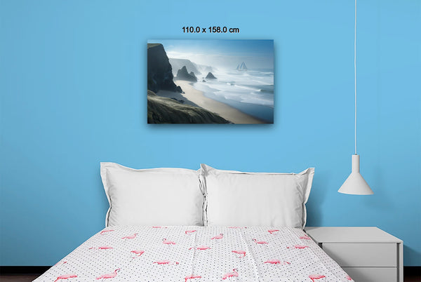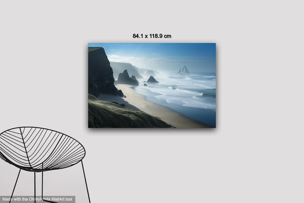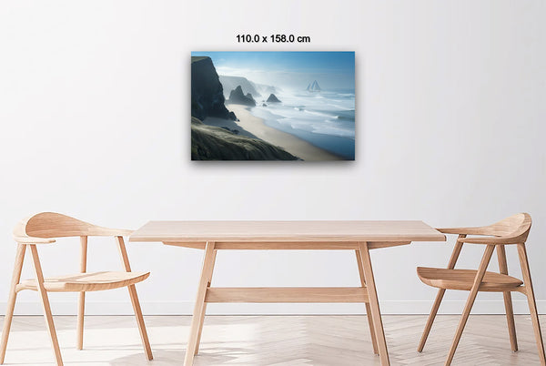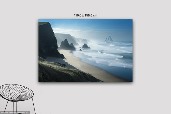 This enchanting Cornish scene features cliffs slowly fading into the mist, creating a quintessential dreamy perspective. Gentle waves introduce a sense of movement, while a distant sailboat glides across the water, adding a touch of life. The serene harmony of the scene is highlighted by the dominant pale blue sea, the soft yellow sand, and the muted black cliffs.