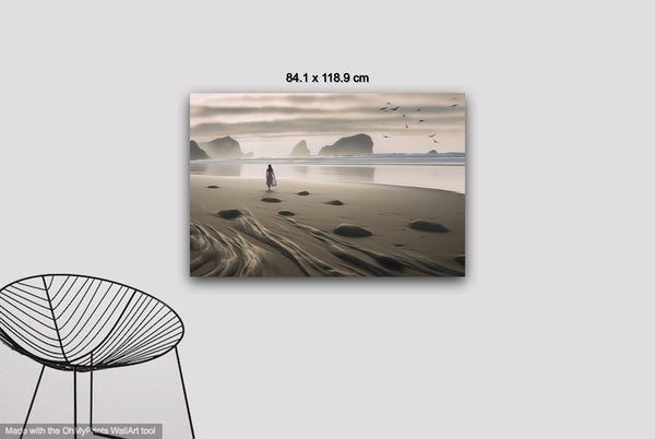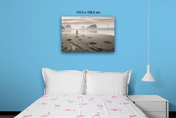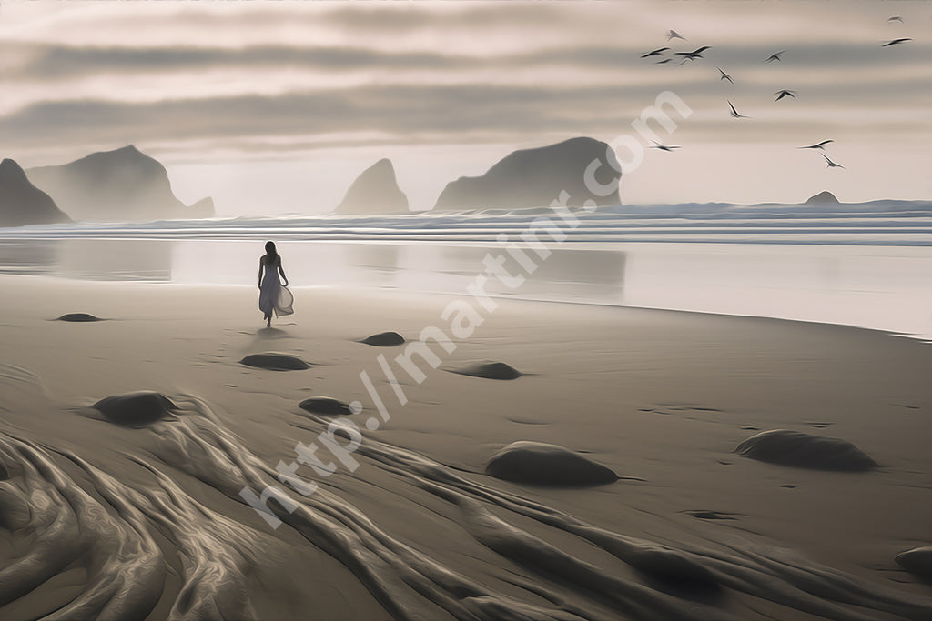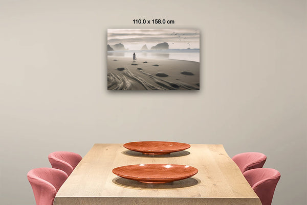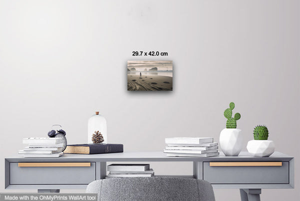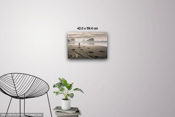 At Holywell Beach, North Cornwall, the tide's movement crafts exquisite sinuous lines in the golden sand. Dunes rise behind, and distant cliffs and rocks outline the horizon. A lone female figure in the distance brings a human touch to this vast, enchanting landscape, highlighting the harmonious interplay between nature and humanity.