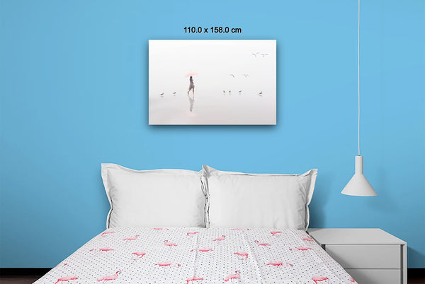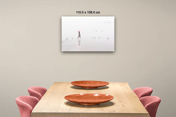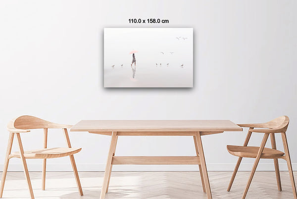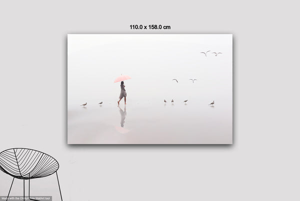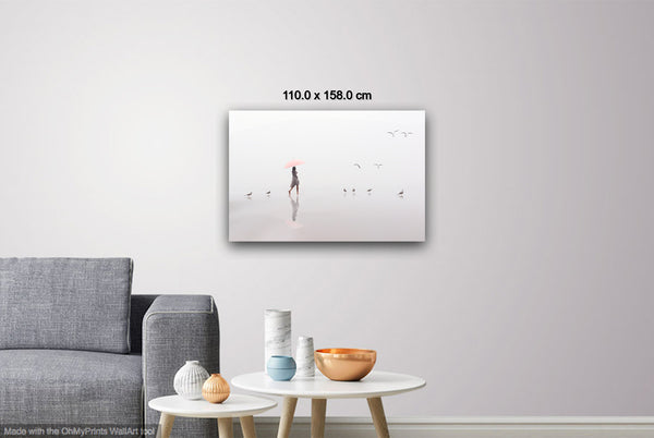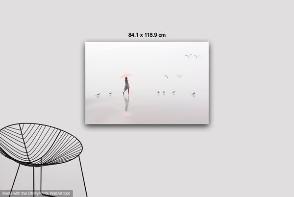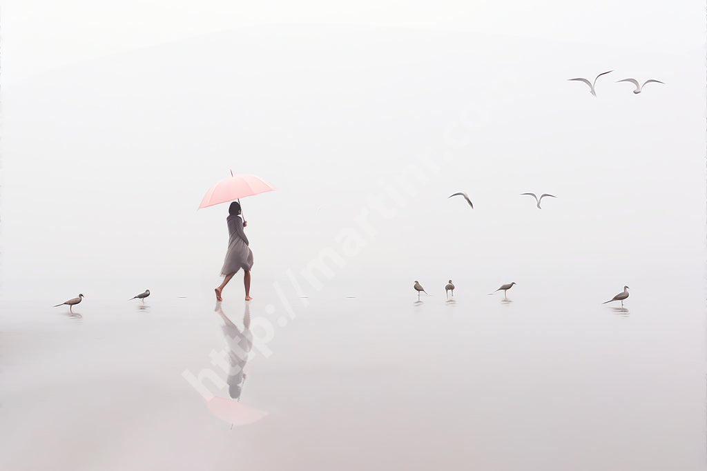 A woman with a pink umbrella moves gracefully along the misty shoreline, while four seagulls dance in the air above her, their flight echoing her steps. The soft fog blurs the horizon, creating an ethereal atmosphere where sea, sand, and sky merge into one.