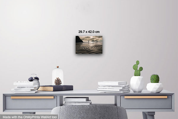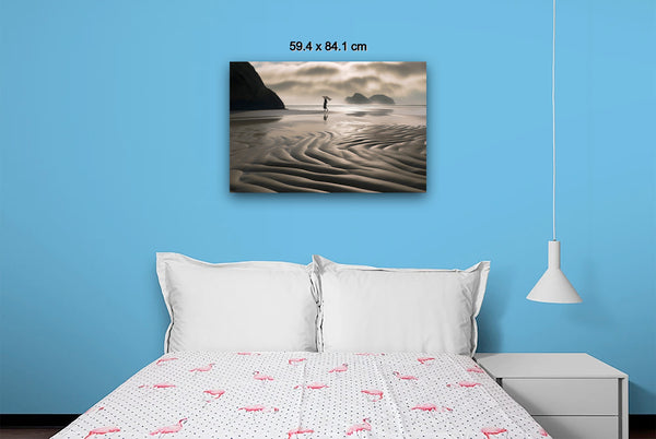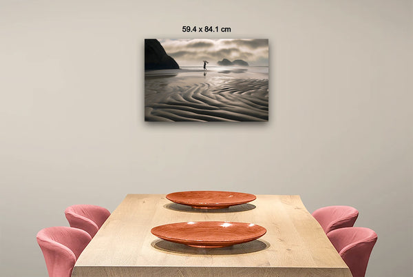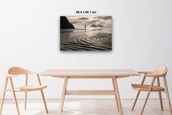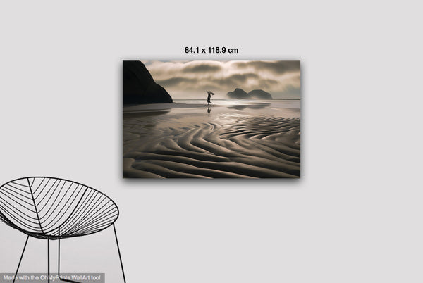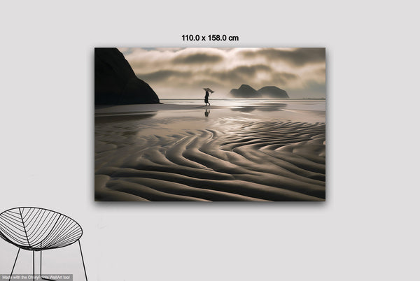This captivating image of Holywell Beach in North Cornwall showcases the natural artistry of tide-carved sand, forming elegant sinusoidal patterns. Backed by dunes and framed by distant cliffs and rocks, the scene is completed by a female figure in the distance, whose presence subtly enhances the grandeur and tranquility of the sweeping coastline.