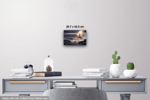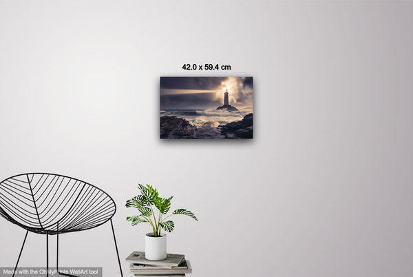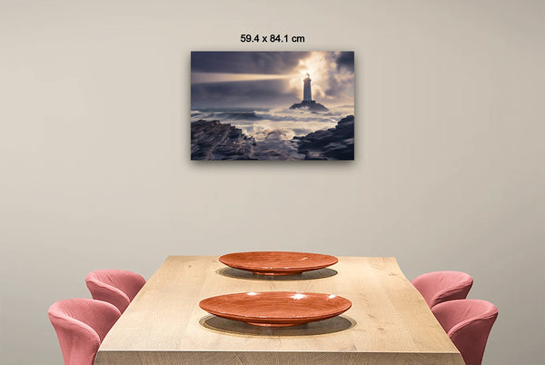 A lighthouse stands defiant against the tumultuous sea, with wild, crashing waves creating a mesmerizing dance of power and light. Captured through the lens and digitally manipulated to reflect the raw emotion felt at the moment of shooting, this piece embodies the fierce, unrelenting energy of nature.