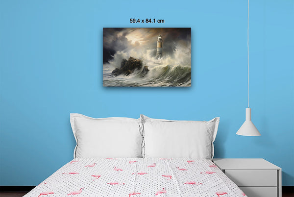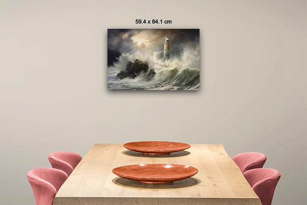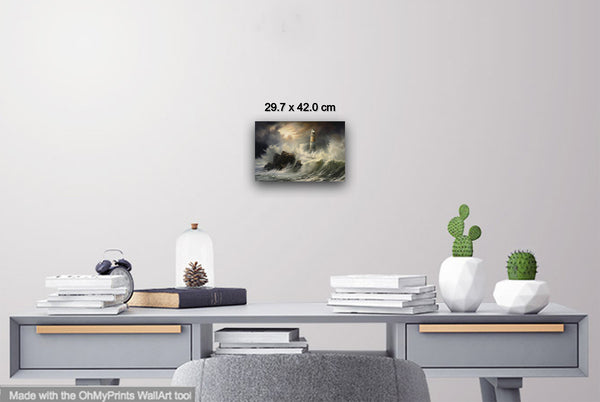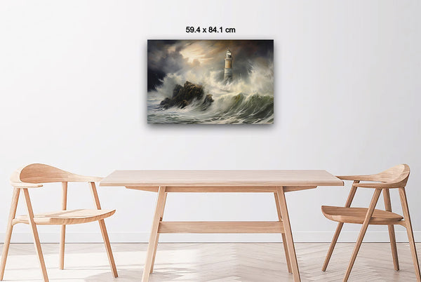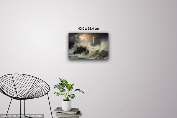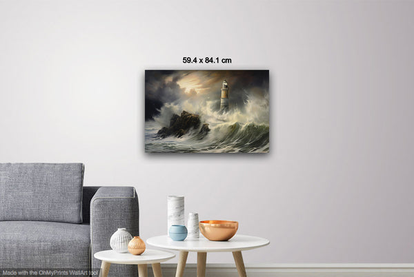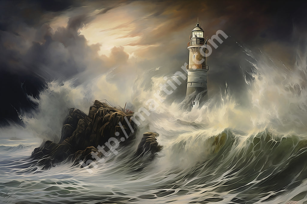A storm batters the coast as waves violently clash against the lighthouse, its beacon piercing through the gloom. Shadows twist through the air, blending with sea spray and dark clouds. Digital manipulation enhances the contrast, giving the scene a surreal, dreamlike quality.