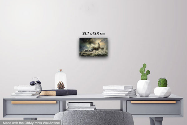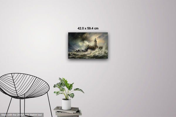 Encircled by frothy, churning waves, the lighthouse stands as a testament to human perseverance and the untamed beauty of nature. Capturing reality with a camera and then digitally altering the light, this artwork reflects the photographer's feelings of awe and admiration for the raw power of the sea.