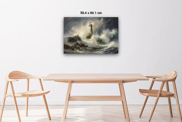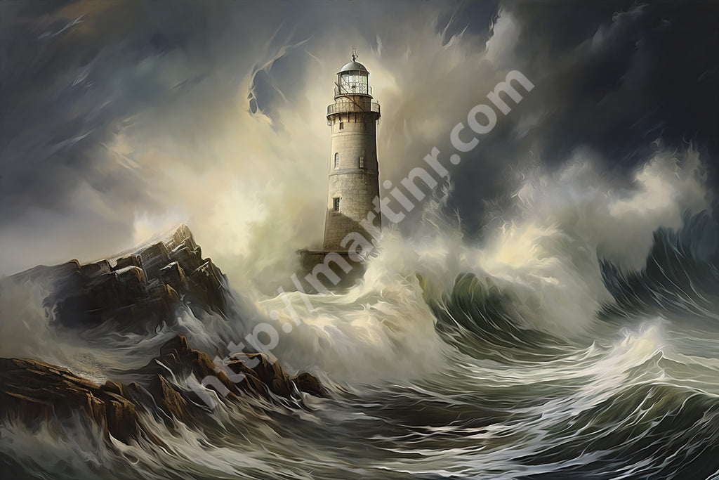 The lighthouse stands alone as fierce winds whip through the air, churning the sea into a frothing mass. Lightning splits the sky. The use of digital manipulation and generative collage creates a heightened sense of drama, making the scene feel both otherworldly and vivid.