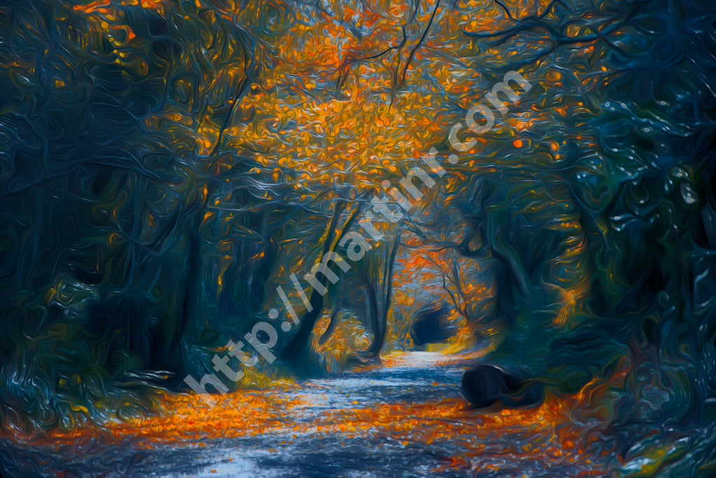 "Colorful Walk" transforms a forest path into a vibrant journey of light and texture. Layers of digital manipulation blend photography with a painterly aesthetic, where the golden glow of autumn leaves contrasts vividly with the shadowy embrace of the surrounding woods. Each detail has been meticulously crafted to evoke warmth and wonder, immersing the viewer in a scene that celebrates the fleeting beauty of nature's transitions. This digital collage transforms reality into a moment of surreal brilliance, inviting a contemplative walk through the interplay of color and shadow.