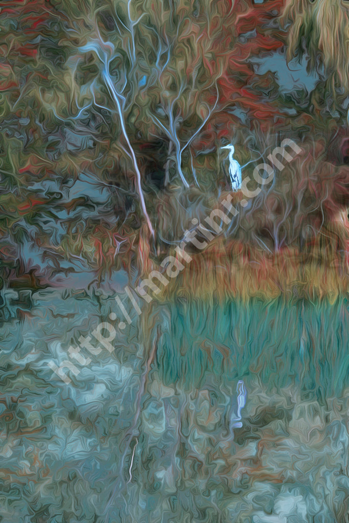 Inspired by a heron named Ermintrude, a regular visitor to a tranquil pond, "Hermintrude II" is a masterful digital collage that merges photography with layers of digital manipulation to achieve a painterly serenity. Each detail—delicately interwoven—transforms the scene into an ethereal moment of calm. The heron, perched amidst textured reflections, becomes the focal point, its stark elegance offset by the vibrant yet muted tones of the water and foliage. Years of pre-digital techniques and modern refinement shape this tranquil tableau, inviting viewers to linger, connecting with the quiet harmony between nature and art.