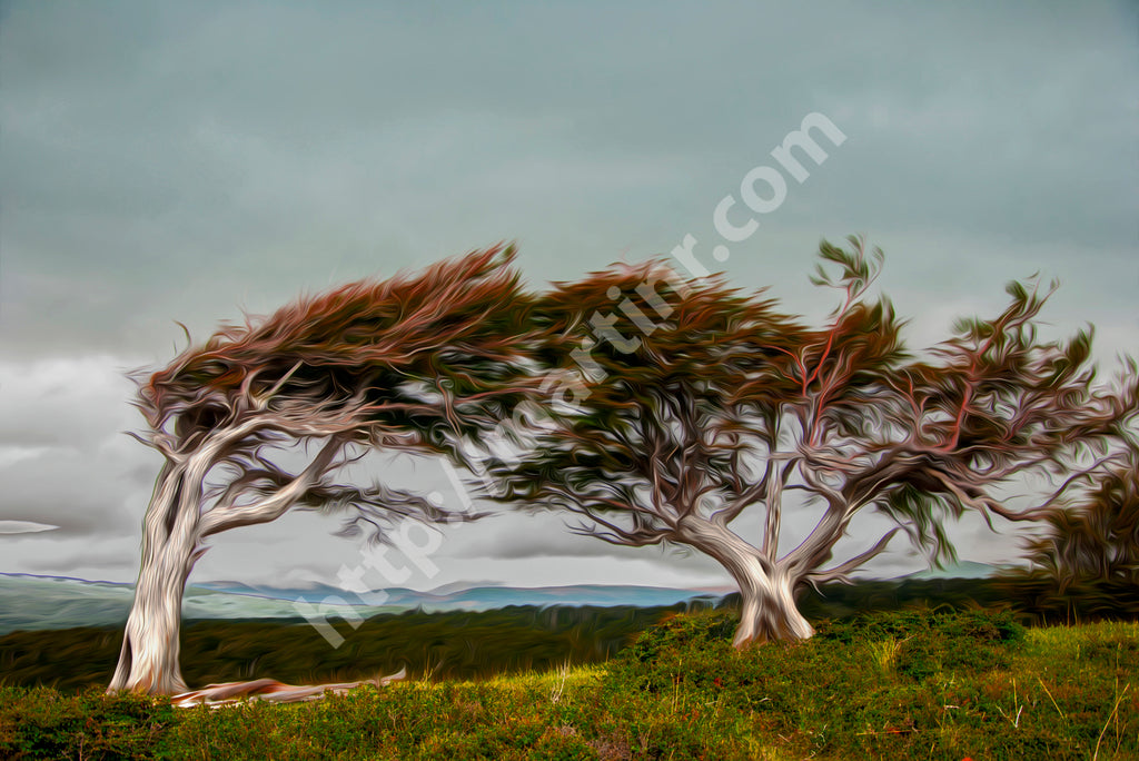 "Seduction Game" captures the interplay of nature’s elements through intricate digital manipulation. Beginning with the raw essence of photography, layers of digital collage redefine the relationship between two windswept trees, their forms bending in a silent dance. The artful fusion of textures and tones draws the viewer into a narrative of resilience, longing, and connection. This piece transforms a windswept scene into a visual metaphor, inviting reflection on the delicate balance of forces in nature and life.