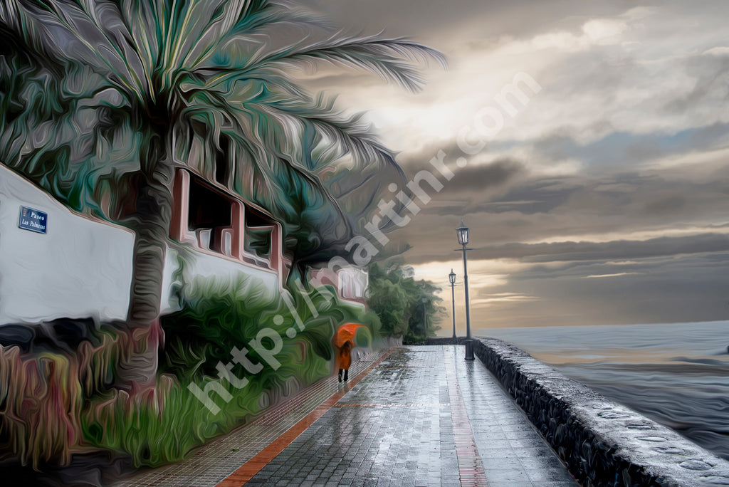 Origin of this image: I travel searching mainly for nature, woods, seas, deserts, even though landscapes can also be urban. Like any tourist, I travel with my camera capturing reality. It is later on, at home, at my desk, that the fun starts. Manipulating an image can take days, weeks, or much, much longer. This image originates in a beautiful location in La Gomera, one of the Canary Islands. The coast promenade is in Valle Gran Rey.