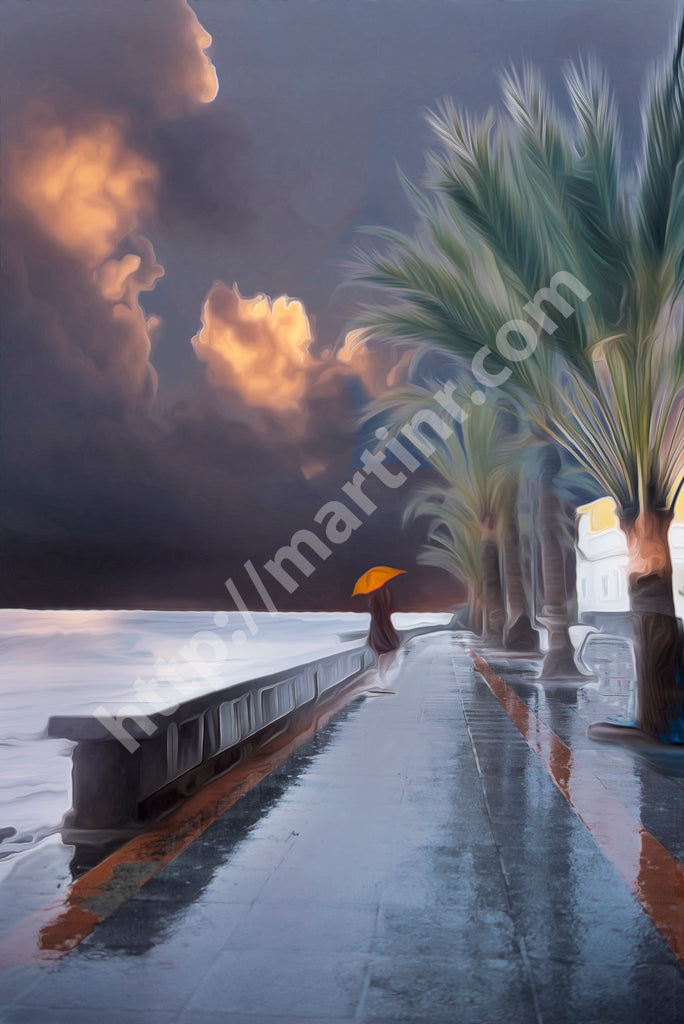 The overall mood is one of contemplative solitude mixed with atmospheric tension, evoking feelings of romantic melancholy and the sublime power of nature. The composition uses strong linear perspective created by the waterfront walkway and colonnade to draw the eye toward the distant figure, while the towering palm trees and dramatic sky create vertical movement that emphasizes the scale and drama of the approaching weather. The artistic style appears to be contemporary digital painting with smooth, somewhat stylized rendering that emphasizes atmospheric effects and emotional resonance over photographic realism.Limited Editions Digital Manipulated Photography.