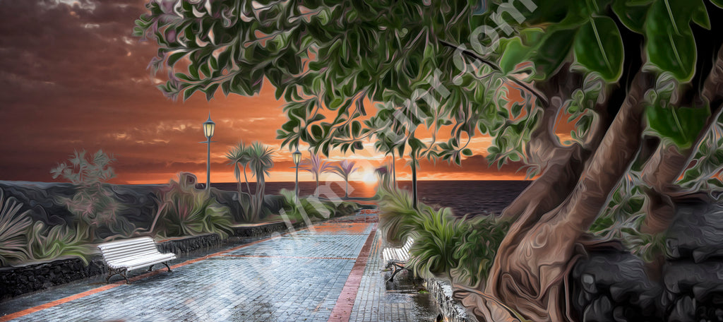Origin of this image: I travel searching mainly for nature, woods, seas, deserts, even though landscapes can also be urban. Like any tourist, I travel with my camera capturing reality. It is later on, at home, at my desk, that the fun starts. Manipulating an image can take days, weeks, or much, much longer. This image originates in a beautiful location in La Gomera, one of the Canary Islands. The coast promenade is in Valle Gran Rey.