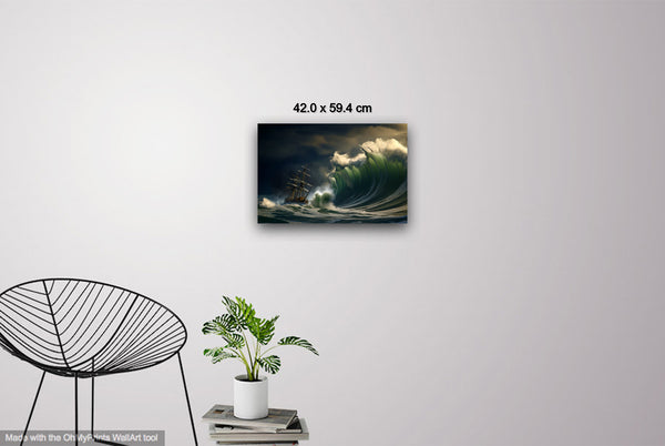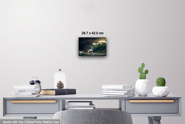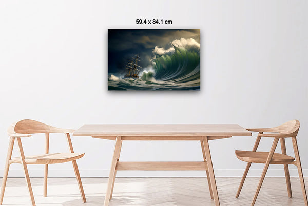"Big Wave XXI" showcases the power of digital manipulation and generation, using a digital collage technique to blend layers of reality and imagination. By dramatically scaling up the wave, the artist distorts perception, transforming the natural into the surreal. The contrast between the ship and the towering wave creates a sense of awe and unease, pushing the boundaries of what feels possible. This manipulation of scale not only amplifies the intensity of the scene but also blurs the line between dream and reality, as if imagination itself has taken control. Through careful layering, the piece becomes a striking fusion of technique and creativity.