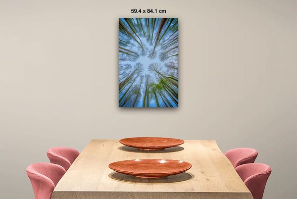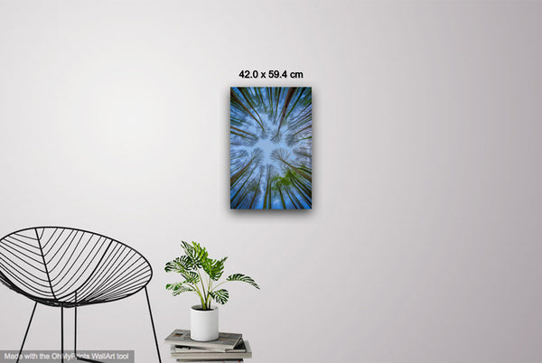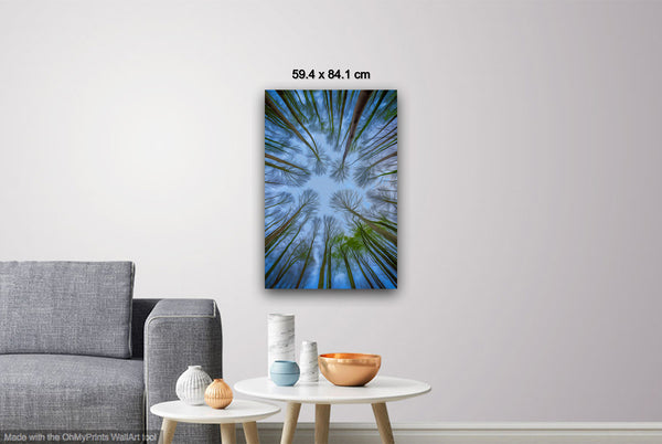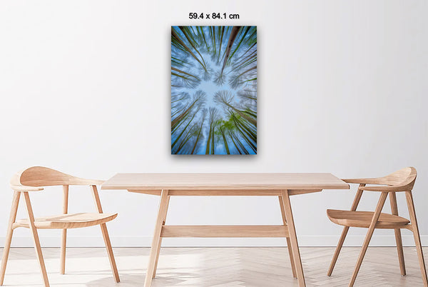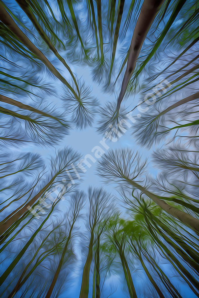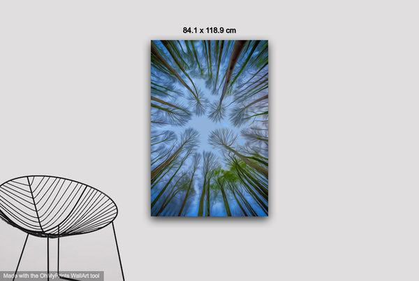 In this serene image, the lush green tree trunks stretch upward into a clear blue sky, their crowns forming a harmonious, rounded canopy. The natural spacing between the tops of the trees allows each to stand alone while collectively creating a peaceful rhythm in nature's design, blending life and space into perfect equilibrium.