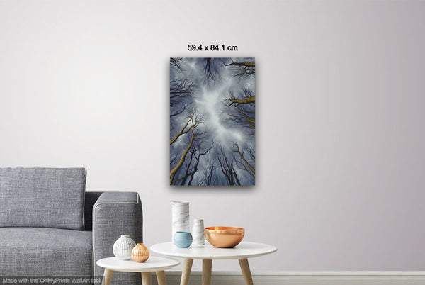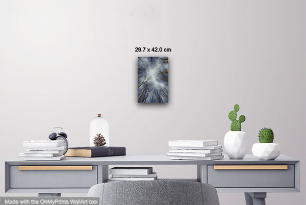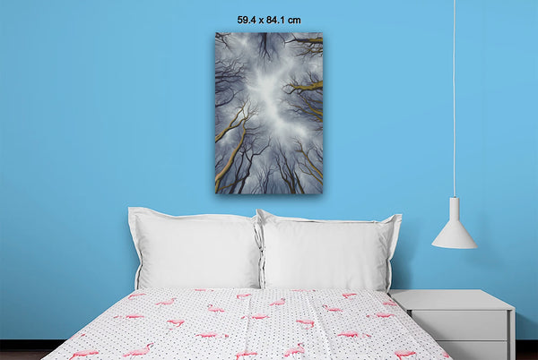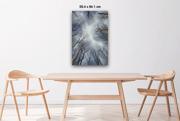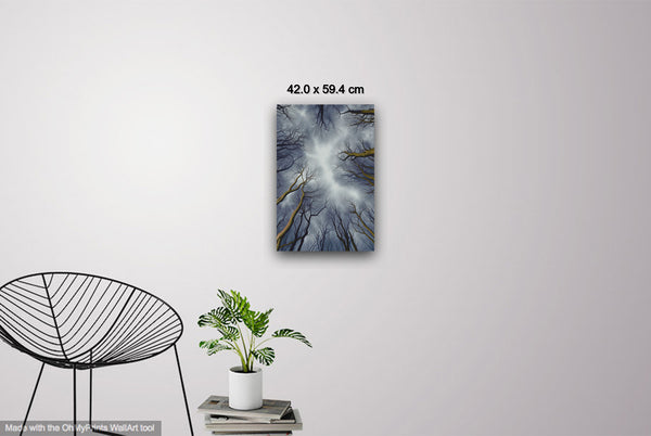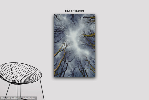 The tree crowns in this striking image create jagged spaces, reminiscent of a lightning bolt zigzagging across the sky. The sharp contrast between the crowns and the open space highlights the energetic tension within the natural world, a dynamic and electrifying display of nature’s patterns.