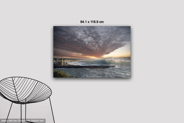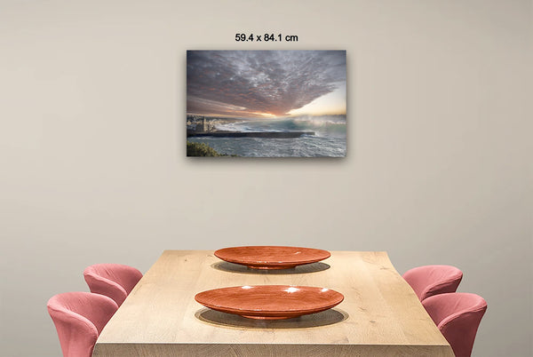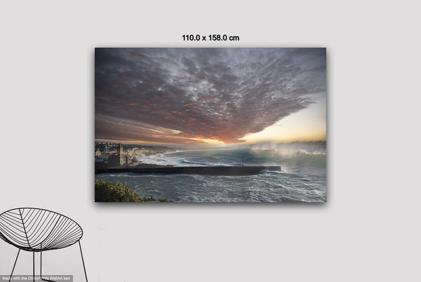 This scene uses digital manipulation and collage techniques to merge coastal elements with a dramatic sky at dusk. Texture and light play a key role, focusing on contrast without generative processes, achieving depth through layered blending.