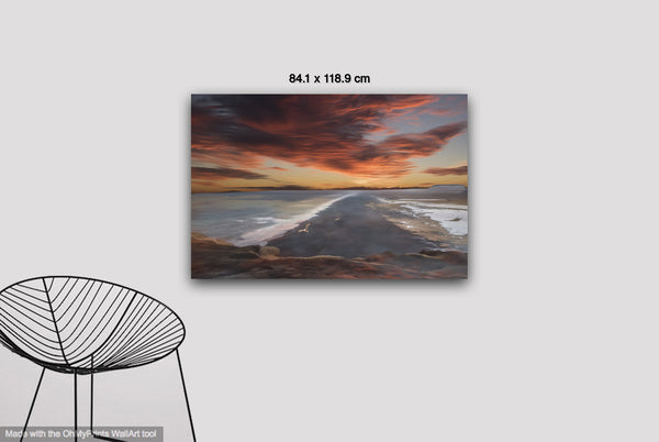 This breathtaking landscape painting depicts a dramatic coastal scene at sunset or sunrise, featuring a distinctive dark peninsula or sandbar jutting into calm waters. The composition centers on this prominent landform that creates a striking pathway across the serene bay or lake, with a solitary seagull perched on its surface, adding scale and life to the expansive vista. Rolling hills and distant mountains frame the horizon, while the foreground shows rocky shoreline and tidal pools that reflect the sky's magnificent colors.