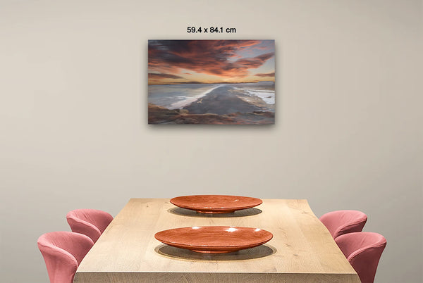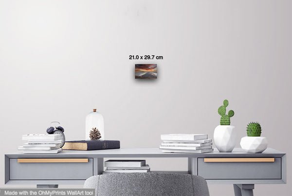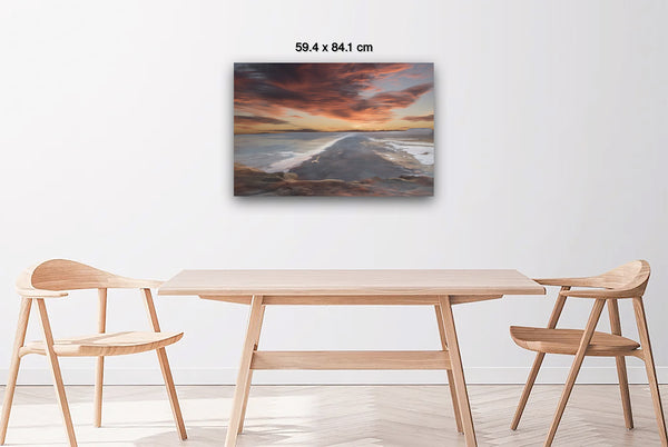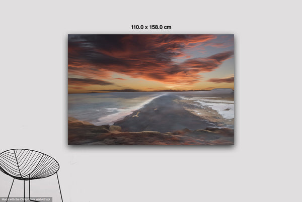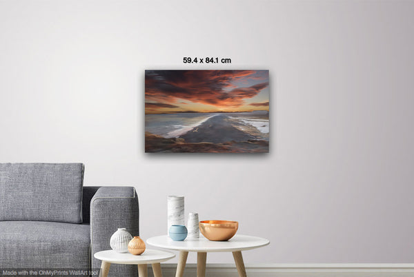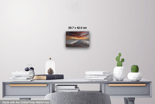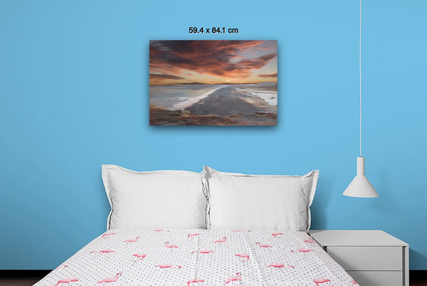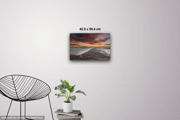 The overall mood is one of tranquil grandeur and contemplative solitude, evoking feelings of peaceful isolation and natural majesty. The composition masterfully balances the horizontal expanse of water and sky with the vertical drama of the cloud formations, while the dark landform serves as a powerful anchor point that draws the viewer's eye deep into the scene. This work exemplifies romantic landscape painting traditions, emphasizing nature's sublime beauty and the emotional resonance of dramatic lighting conditions during golden hour.Limited Editions Digital Manipulated Photography.