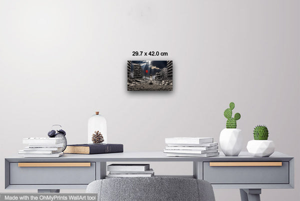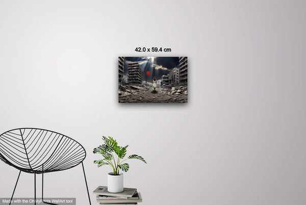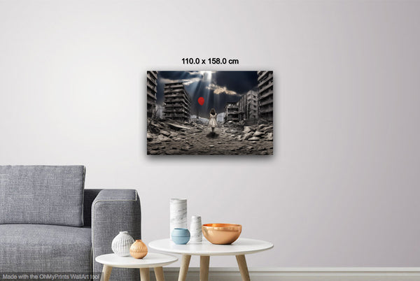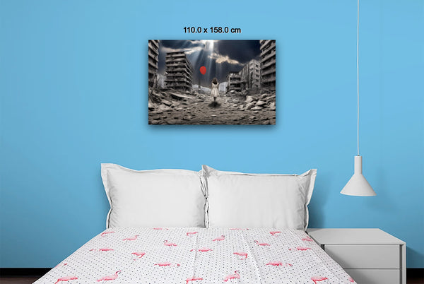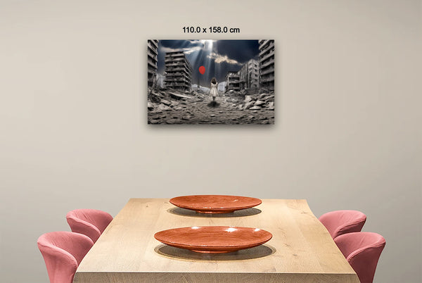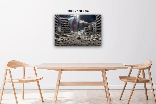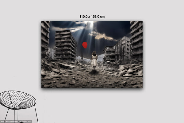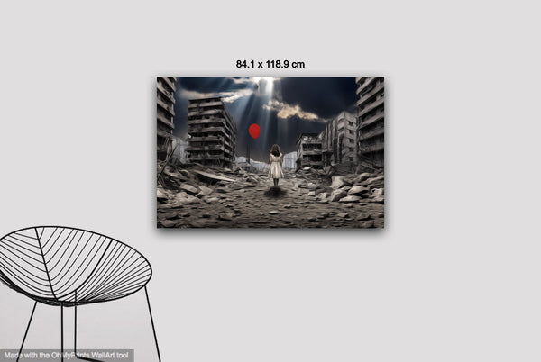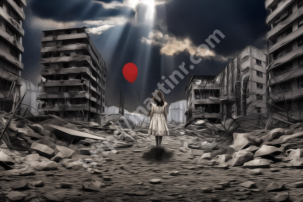 "A Balloon’s Promise" emerges through intricate digital manipulation, blending muted urban decay with a vivid symbol of hope. The digital collage layers devastation and resilience, transforming photographic origins into a painterly narrative. The bright red balloon, tethered to the child’s hand, stands in stark contrast to the grayscale ruins, representing optimism amidst despair. Careful adjustments in light and shadow create a dynamic atmosphere, drawing the viewer toward the promise of renewal in a broken world.