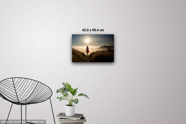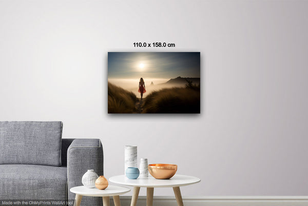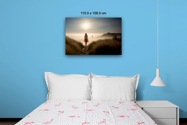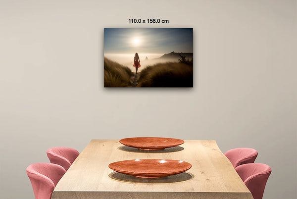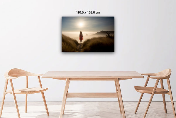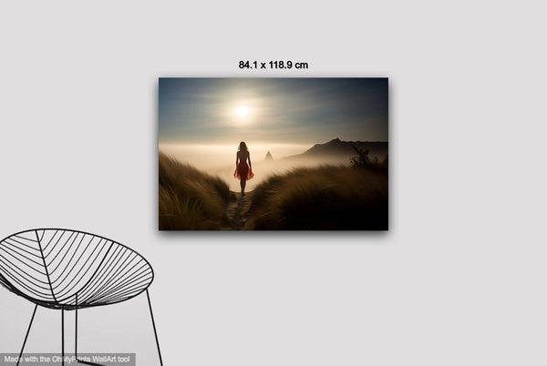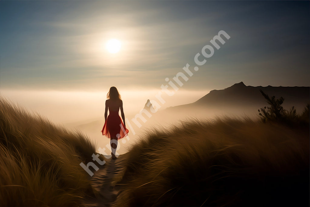 "Dunes 11" showcases the dramatic interplay of light and shadow, enhanced by digital manipulation to create a rich, atmospheric landscape. The warm glow of the sun casts soft shadows across the dunes, inviting the figure in red to walk toward the horizon. Layer by layer, textures and colors are blended, turning the scene into a dynamic digital collage that feels both alive and introspective. This piece captures the essence of a quiet journey through a stunning natural world, where each element contributes to an immersive experience of peace and reflection.