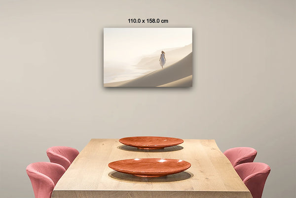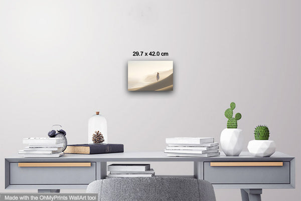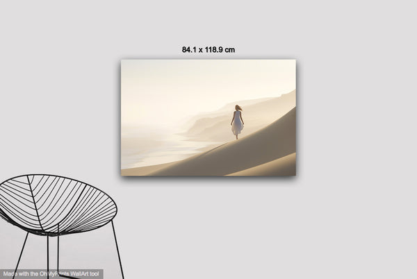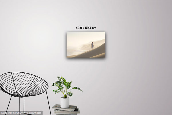 In "Dunes 17," digital manipulation elevates the scene into a soft, ethereal landscape. Layered gradients and subtle textures create a minimalist digital collage, capturing the vastness of the desert in gentle tones. The lone figure on the dune, small against the sweeping landscape, adds a sense of scale and solitude. Through careful blending of light and shadow, the image feels almost painted, as if the desert is veiled in mist. This piece reflects a balance of simplicity and depth, where each layer enhances the quiet serenity of the dunes.