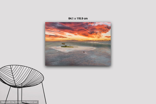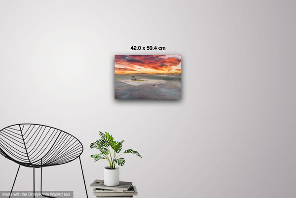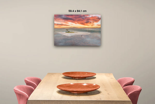 The sky dominates the upper two-thirds of the image with an extraordinary display of warm colors ranging from deep coral and salmon pink to brilliant orange and gold, punctuated by dramatic purple-gray storm clouds. The color palette creates a harmonious gradient from the fiery sky down through amber-tinted horizons to the cool blue-green ocean tones below. This spectacular lighting suggests either sunrise or sunset, with the warm light reflecting beautifully on the water's surface and creating a mirror-like quality that doubles the visual impact of the colorful sky. The overall mood is one of serene isolation and natural grandeur, evoking feelings of wanderlust, tranquility, and the sublime beauty of untouched tropical landscapes. The photographic technique emphasizes both the dramatic scale of the seascape and the intimate details of this small island refuge, creating a perfect balance between vastness and intimacy.Limited Editions Digital Manipulated Photography.